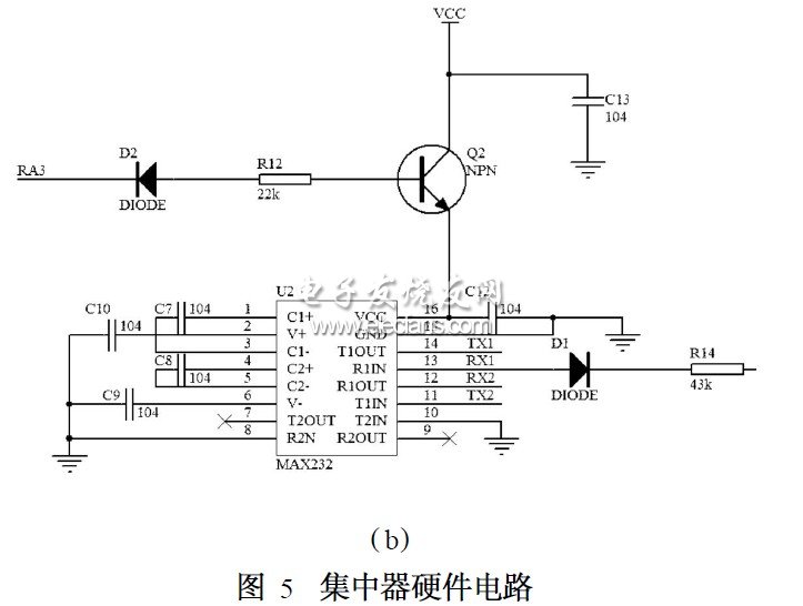 集中器由主控芯片PIC16F84、上行通信接口电路、下行通信接口电路、电源电路等几部分组成。集中器硬件电路如图5所示。