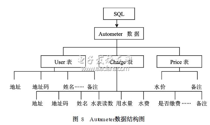 主站是远程集中抄表系统的数据处理中心,处于系统的最高层次。在集中器、网络水表协助下通过网络接口负责完成设备管理、用户管理、水量的抄收以及报表打印等功能,远传水表管理系统。根据SQLSever的数据库体系结构和自动抄表管理软件系统的数据内容,得出如图8所示的Autometer数据结构图。