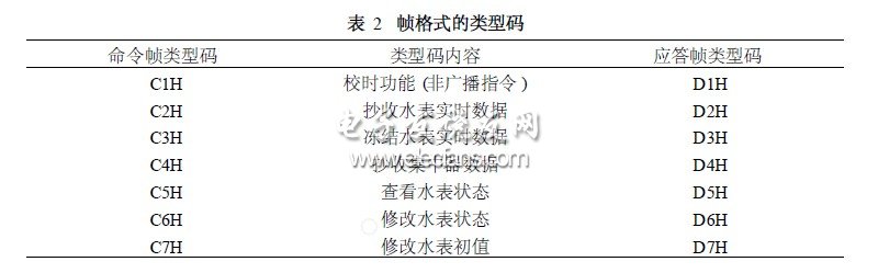 2)类型码:1个字节,命令帧类型码用来规定上位机管理系统下达指令的具体内容,不同的内容对应不同的类型码。集中器执行相应指令后上传相应的应答帧类型码,不同的内容对应不同的类型码,命令帧和应答帧类型码如表2所示。