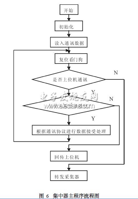 集中器的软件设计主要包括集中器主程序的设计、集中器接受命令子程序的设计、集中器向采集器发命令子程序软件的设计、集中器向PC机应答子程序的设计。集中器主程序流程图如图6所示。