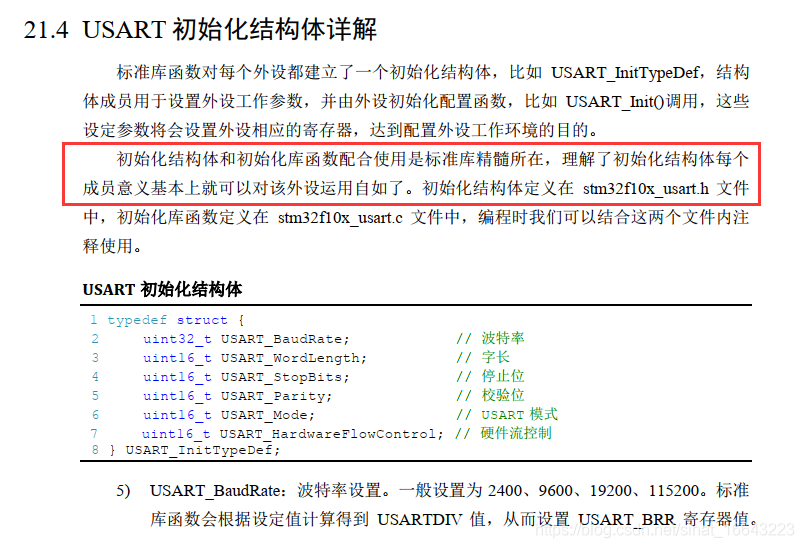 2,然后设置对应串口控制器的一些参数(也就寄存器的一些参数),完成对串口的基本设置,比如UART的波特率等等的。要配置哪些参数一般在对应外设的初始化结构体里都列了。所以这个步骤就变得很简单,就往对应外设的初始化结构体里面赋值就行了。而且我发现对引脚的设置其实也是对引脚的那个结构体的里面的参数赋值!!!!!都给它弄成结构体了,很方便!!!!!!!!!!所以整个过程就变成了往两个结构体里面填值就可以了,怪不得都不不需要变成用STM32cube选几下就可以了!!!!!!确实本质就是这样子的!!!!!!!