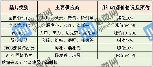 从业内人士反馈来看,尽管供应链的库存水位提高不少,但芯片厂接单量仍明显大于供给,且晶圆代工及封测产能供不应求,业界认为,在未来两个季度芯片价格将保持上涨趋势。其中,面板驱动IC、电源管理IC、MOSFET等已确定明年Q1涨价10-20%,而CMOS传感器、微控制器、WiFi网络芯片等产品也将响起涨价的声音。
