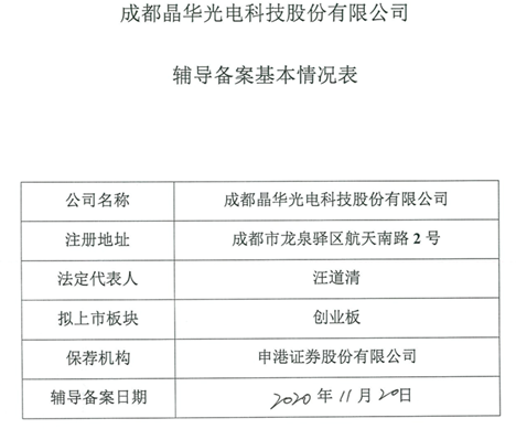 近日,成都晶华光电科技股份有限公司(公司简称:晶华光电)拟首次公开发行股票并在创业板上市,现已于2020年11月20日完成辅导备案,保荐机构为申港证券股份有限公司。