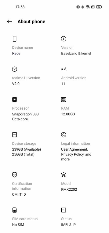 realme新机型号RMX2202,搭载骁龙888处理器,12GB RAM/256GB ROM,运行基于Android 11的Realme UI 2.0系统。