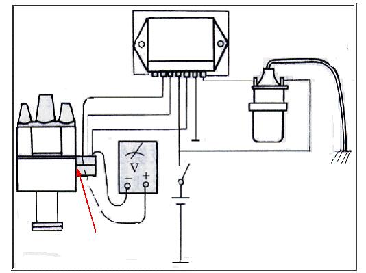 关掉点火开关,打开分电器盖,拔下分电器盖上的中央高压线并搭铁,如图1所示;将电压表两触针接在霍尔信号发生器连接器信号线(绿白线)和搭铁线(棕白线)间(或控制器插头3、6之间);