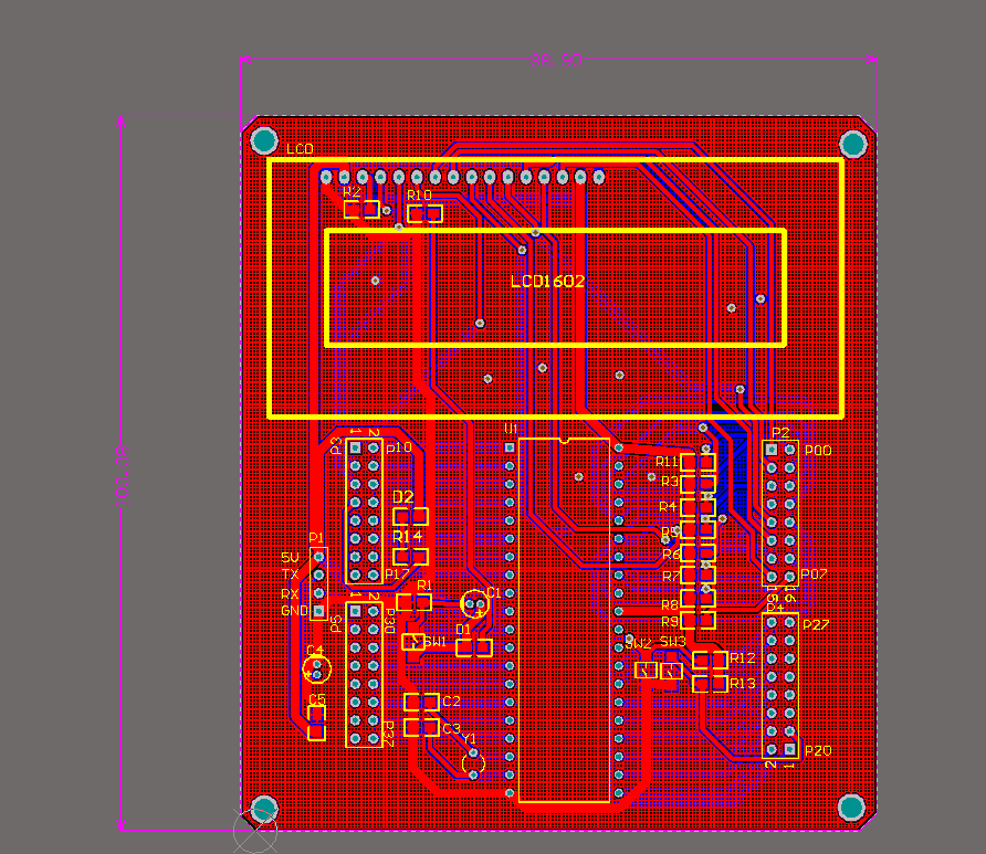原理图很简单,单片机最小系统,LCD1602,外加几个按键,绘制完的PCB长这样