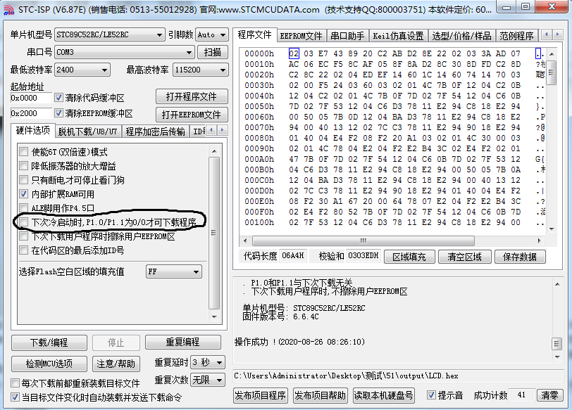 重点就是这个地方,由于第一次勾选了这个选项,所以,下一次下载程序的时候,p1.0和P1.1要拉低才行,接GND后,果然,没有问题了。所以果断将这个选项去掉啊 亲。