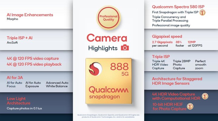 在骁龙 888 上,它对于拍摄能力的支持也到了全新的高度,其中最关键的就是 3 个 ISP(Image Signal Processor,图像信号处理器)的加入,这是 Qualcomm Spectra 首次支持 3 个 ISP。