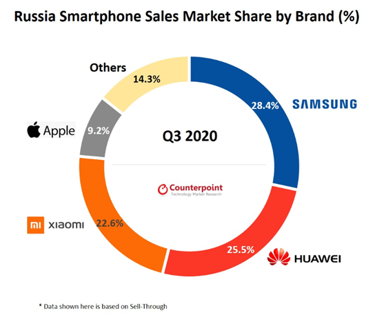2020年12月06日 | 市调机构:Q3三星超越华为成俄罗斯智能手机市场冠军