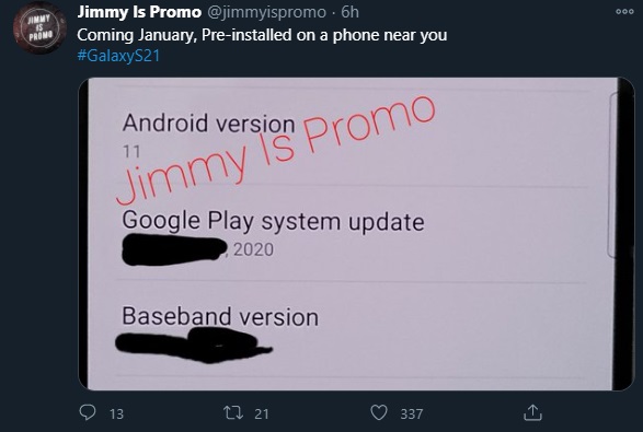 知名爆料者 @jimmyispromo 今日放出了一张声称是三星 Galaxy S21 的谍照,透露该机将运行基于安卓 11 的 One UI 3.1 操作系统。