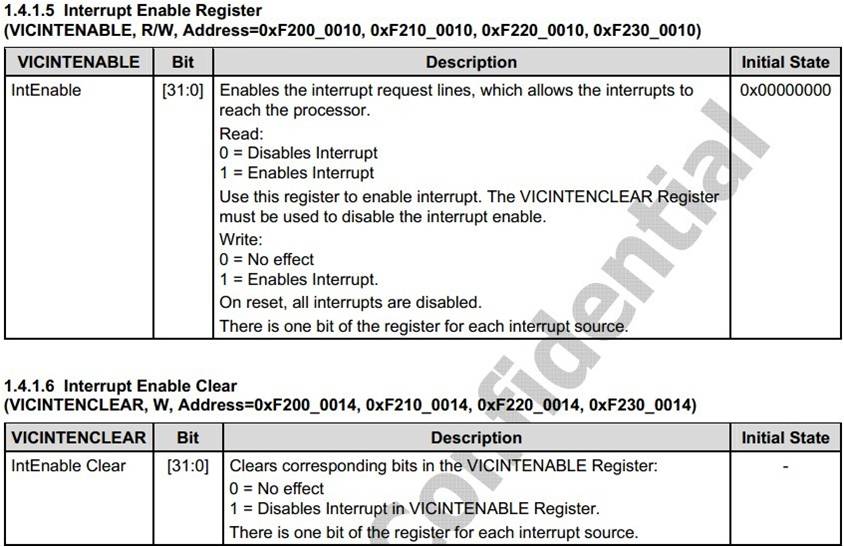 中断允许寄存器中,每个bit代表一个中断源。向VICINTENABLE寄存器中相应bit写1可以使能该中断(写0无效,读取时若该中断允许则返回1,若未允许则返回0),而向VICINTENCLEAR寄存器相应bit写1可以禁止该中断(写0无效)。