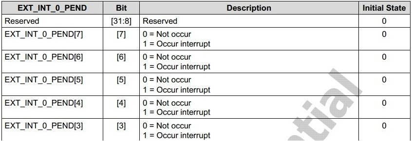 EXT_INT_xPEND(x=0~3)用来标识外部中断挂起。向相应bit写1可以清除中断挂起