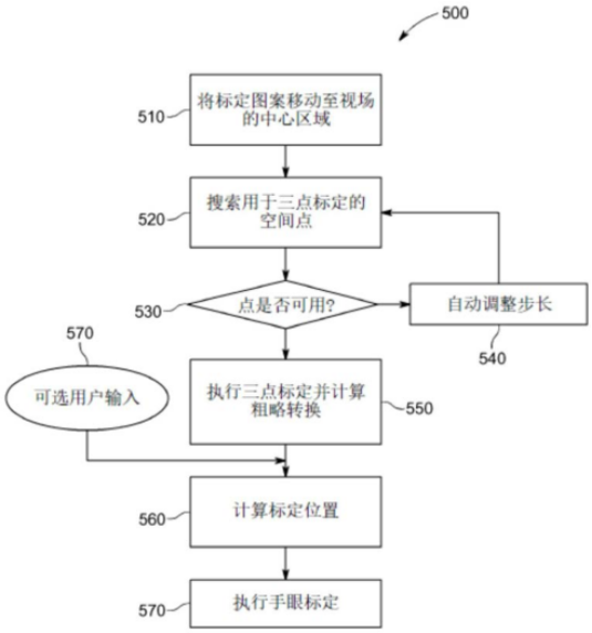 其后,过程500会进一步确定空间点在标定系统中的可用性,然后基于视觉系统的反馈来自动调整步长大小,直至上述目标对象保证处于视场的中心。