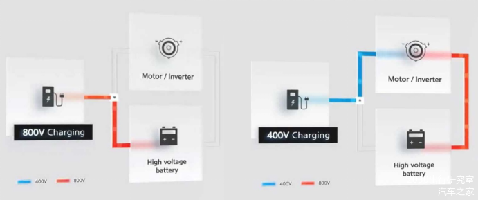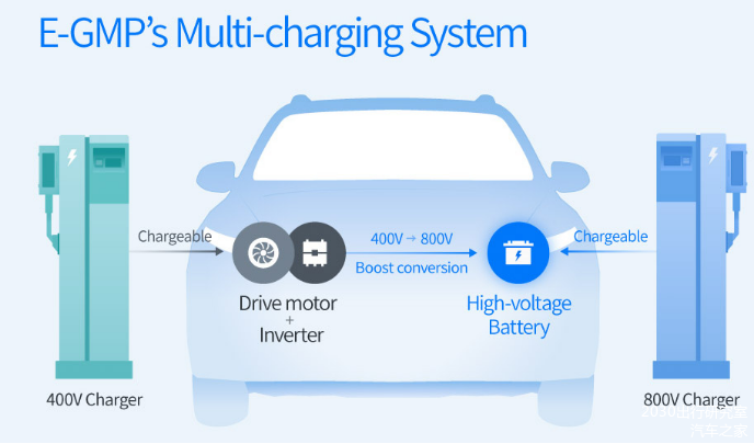 在充电方面,E-GMP是考虑了不同电压平台来设计的。在800V的高端系统上面,800V充电站直接对电池系统进行充电,而在400V的充电桩上,则是通过电机电控系统进行升压,再充入电池系统。