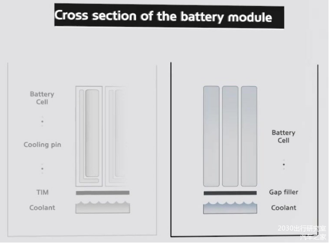 在模组的结构上,和之前现代发表的技术论文相似,电芯之间取消了Cooling Pin,电芯底部采用导热胶Gap filler进行调整,通过底部冷却的方式进行导热,在小模组结构上设置了绑带的固定结构加强模组的刚度。这个要支撑“在350kW的功率下,18分钟内可充电80%”,是考虑了完整的大模组带来的应力不均匀,还有散热不均匀的问题。