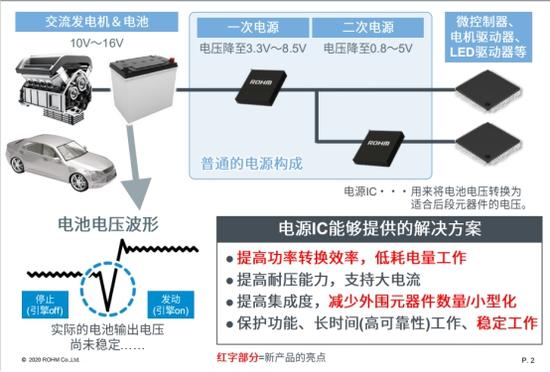 汽车的电池电压在引擎发动时会有较大的波动。一次级电压输出波形对比,绿色是电池电压,蓝色是普通产品输出电压的表现,红色是BD9P系列传输电压的表现。当引擎发动时,电池电压下降到谷底;引擎停止时,电池电压恢复正常。