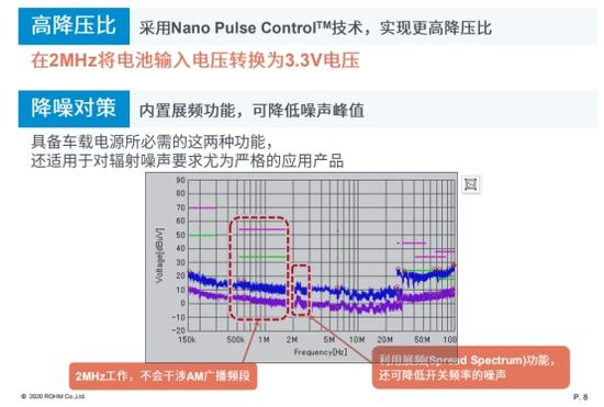 ROHM自有的超高速脉冲控制技术“Nano Pulse Control”,始终在不干扰AM广播频段(1.84MHz Max.)的2.2MHz工作,对于最大40V的高电压输入,还实现了由后段元器件驱动的3.3V~5.0V级稳定输出。此外,还内置展频功能,可降低噪声峰值,因此非常适用于对辐射噪声要求尤为严格的车载应用。