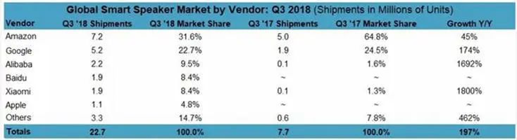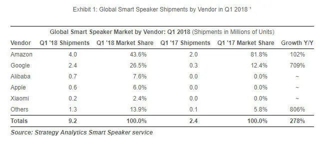 当时,全球智能音箱市场正处于爆发期。根据市场调研机构 Strategy Analytics 发布的全球智能音箱出货量报告,Amazon 拿下 400 万台,Google 借助发布不久的 Google Home Mini 增长了 7 倍,达到 240 万部——阿里巴巴在中国市场出货量达到了 70 万台。