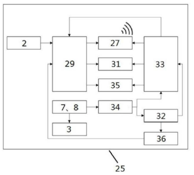 上图1为本专利提出的一种基于UWB测距技术的手机展品防盗器,它包括底座24和标签25。其中,底座24和标签25内分别设有用于收发UWB信号的底座/标签UWB收发射频模块以及用来发生警报信息的底座/标签蜂鸣器。除此之外,底座24和标签25还配备处理器以实现对收发射频数据的处理和蜂鸣器的驱动。