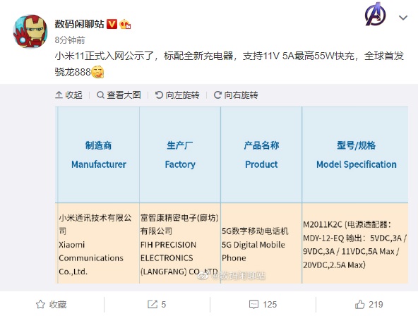 目前小米 11 手机已经通过了国家 3C 入网认证。根据入网信息,小米 11 手机标配全新充电器,支持 11V/5A 最高 55W 快充。此前雷军表示,小米 11 手机全球首发骁龙 888。