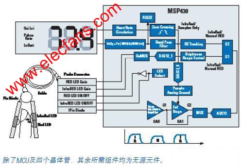 上面的图标示例了一个采用超低功耗MSP430 MCU的单片、便携式脉搏血氧计的实现。由于高层次的模拟集成使得外部组件数量保持了最小化。并且,通过保持通态时间(ONTIme)的最小化以及两个灯光源的周期性供电,使得功耗得以降低。