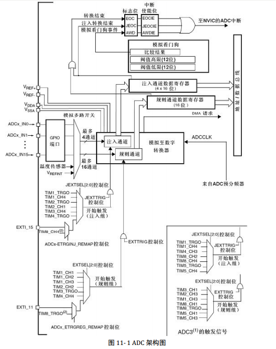输入信号经过这些通道被送到 ADC 部件,ADC 部件需要受到触发信号才开始进行转换,如 EXTI 外部触发、定时器触发,也可以使用软件触发。ADC 部件接收到触发信号之后,在 ADCCLK 时钟的驱动下对输入通道的信号进行采样,并进行模数转换,其中ADCCLK 是来自 ADC 预分频器的。