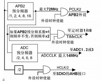 PCLK2 的常用时钟频率为 72 MHz,而 ADCCLK 必须低于 14 MHz,所以在这个情况下,ADCCLK 最 高 频 率 为 PCLK2 的 8 分 频, 即 ADCCLK=9 MHz。 若 希 望 使 ADC以 最 高 频 率 14 MHz 运行,可以把 PCLK2配置为 56 MHz,然后再 4 分频得到ADCCLK。