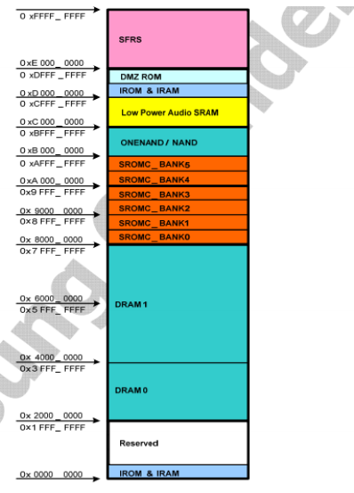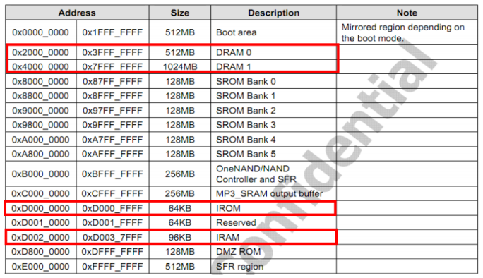 S5PV210 含有一个大小为64KB的IROM,起始地址为0xD0000000,结束地址为0xD000FFFF;含有一个大小为96KB的 IRAM,起始地址为0xD0020000,结束地址为0xD0037FFF;内存起始地址为0x20000000,有二个内存块,DRAM0 和 DRAM1 大小分别为 512MB、 1024MB。