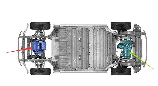在全轮驱动的版本中,后电机为主,负责大部分工作,而前电机只在需要的时候提供动力。两个电机都通过一个独立的单速变速器与车轮相连,前电机可以通过电动车变速器断开器与车轮物理断开,前电机保持断开状态可以提高大多数驾驶场景下的效率。