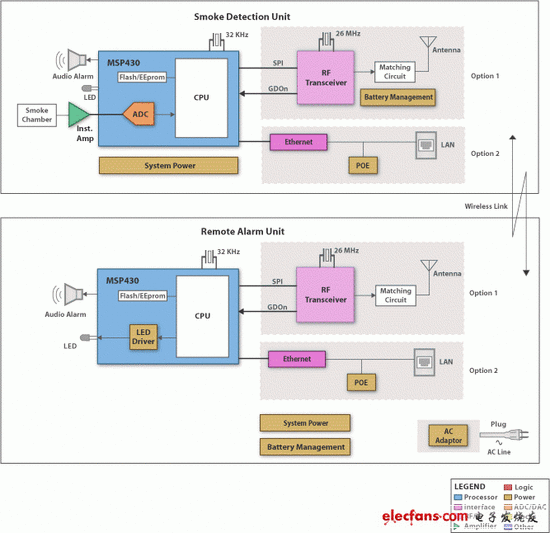 烟雾探测器是为 3 种基本类型的系统实施而设计的:独立式、无线连接和固定/有线连接,前 2 种需要电池供电。烟雾探测器具有 3 个主功能块:传感器和信号链、处理器和通信接口。最基本的独立式探测器通常不需要处理器和通信接口。