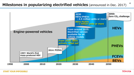 丰田并不是没有发展过纯电动。事实上,丰田是最早一批响应美国加州环保法案的车企,1997年曾经推出了丰田RAV4 EV,销售几年后才退出市场。只不过,在丰田对电气化路线的规划里,混合动力技术始终是主流——2020年电动车推出市场、2025年电动版本覆盖全系、2030年销售电动车/氢燃料车100万辆,直到2050年,电动车仍然不会是丰田的终点,而只是丰田电气化四条路线之一,占比少于混动、插混,略高于氢燃料电池车。