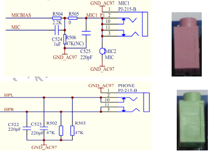 粉红色为麦克风输入接口,另外话筒也可以实现声音的录入;绿色接口为音频输出接口。