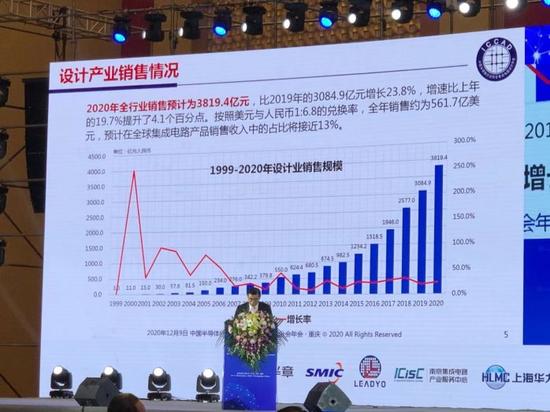 魏少军指出,2020年我国芯片设计企业共计2218家,比去年的1780家增加了438家,数量增长了24.6%。2020年全行业销售预计为3819.4亿元,比去年的3084.9亿元增加了23.8%,增速比上年的19.7%提升了4.1个百分点。按照美元与人民币1:6.8的兑换率,全年销售约为561.7亿美元,预计在全球集成电路产品销售收入中的占比将接近13%。