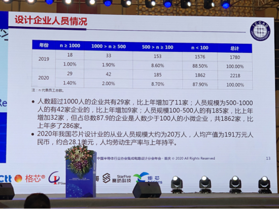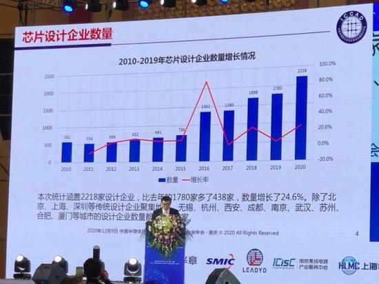 12月10日,中国集成电路设计业2020年会在重庆隆重举行,中国半导体行业协会集成电路设计分会理事长魏少军教授在大会高峰论坛上指出,2020年,我国芯片设计企业达到2218家。