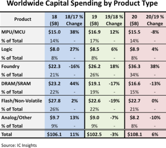 2018年和2019年,全球半导体资本支出分别为1061亿美元和1025亿美元,2020年预计年增率为6%,达到1081亿美元,下图为半导体行业细分领域的资本支出情况: