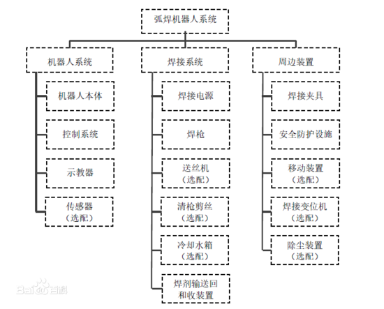 一般的弧焊机器人是由示教盒、控制盘、机器人本体及自动送丝装置、焊接电源等部分组成。可以在计算机的控制下实现连续轨迹控制和点位控制。还可以利用直线插补和圆弧插补功能焊接由直线及圆弧所组成的空间焊缝。弧焊机器人主要有熔化极焊接作业和非熔化极焊接作业两种类型,具有可长期进行焊接作业、保证焊接作业的高生产率、高质量和高稳定性等特点。随着技术的发展,弧焊机器人人正向着智能化的方向发展。