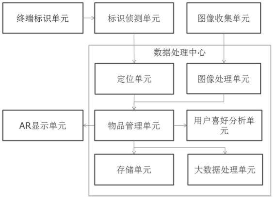 为解决现有技术所存在的问题,本申请提出的智能物品管理系统如图1所示,主要包括终端标识单元、标识侦测单元、定位单元、图像收集单元、图像处理单元、物品管理单元、AR显示单元和存储单元,以及用户喜好分析单元和大数据处理单元。