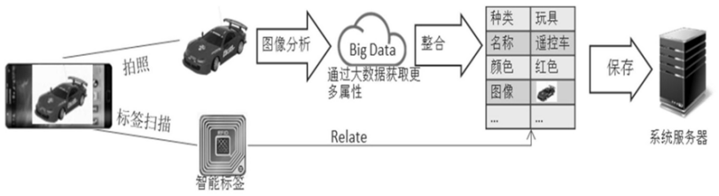 参考图2,首先利用图像收集单元拍摄被标识物,然后通过卷积神经网络(CNN)等进行模式识别和图像分析,识别出被标识物的基本信息,如名称、体积、颜色等,进一步结合互联网大数据,查询出此类物品的材质、用途等等,并整合保存到系统服务器的存储单元中。与此同时,智能标签(终端标识单元)放置到实际物品上,通过对智能标签进行扫描,建立标签标识与物品其他信息之间的关联关系,并进行存储,所有这些存储到存储单元的信息,可以构成一个物品管理库。在用户使用被标识物的时候,物品管理系统可以依据智能标签对用户行为进行记录,进行数据读取,完成整个过程。