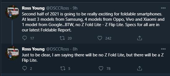 Display Search 和 DSCC 的创始人兼首席分析师 @Ross Young 表示,来年下半年对于折叠手机市场来说有点令人兴奋。他透露,三星将发布至少三款型号的折叠屏手机,而 OPPO,vivo 和小米三家一共将推出的四款型号,而谷歌还将推出一款型号。