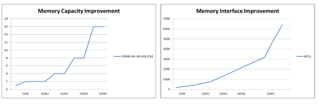 从 JEDEC DDR 协会的标准来看,DDR5 主电压从 1.2 V 降低至 1.1 V,将最大芯片密度提高了 4 倍,最大数据速率提高一倍,突发长度增加一倍,存储单元组数增加一倍。当然,随着以上特性的提升,内存成本和售价有望进一步拉升。简而言之,JEDEC DDR 规范可允许在 DDR5-6400 上完成 128 GB 的无缓冲 DDRM 模块。在电源允许的情况下,RDIMM 和 LRDIMM 能够做到更高。