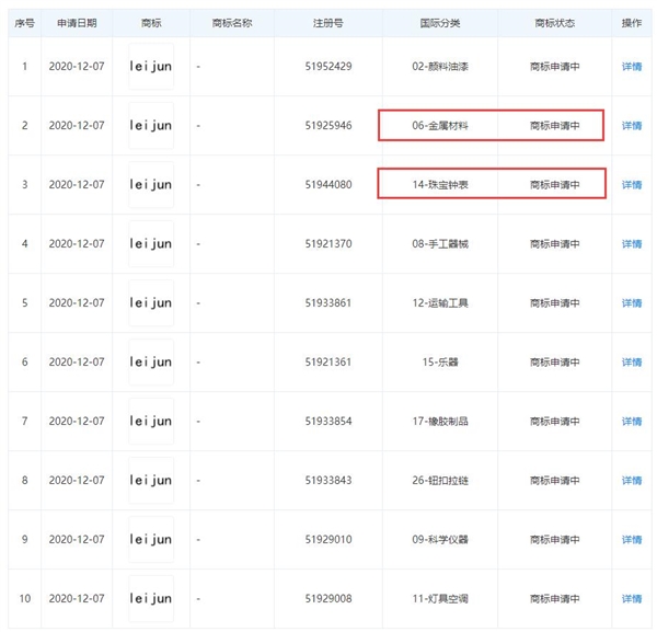 2020年12月14日 | 小米申请雷军拼音商标:涉金属材料、珠宝钟表等