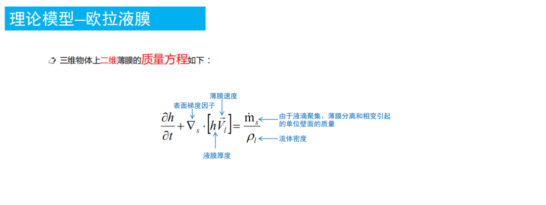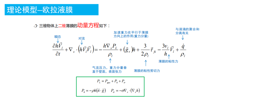 这个薄膜的假设通常建立在欧拉液膜和拉格朗日液膜建模方法之上,相比于固体壁面的曲率半径,这层薄膜的厚度非常小,所以可以近似地认为这层薄膜足 够薄到使得薄膜上的流体流动平行于固体壁面。