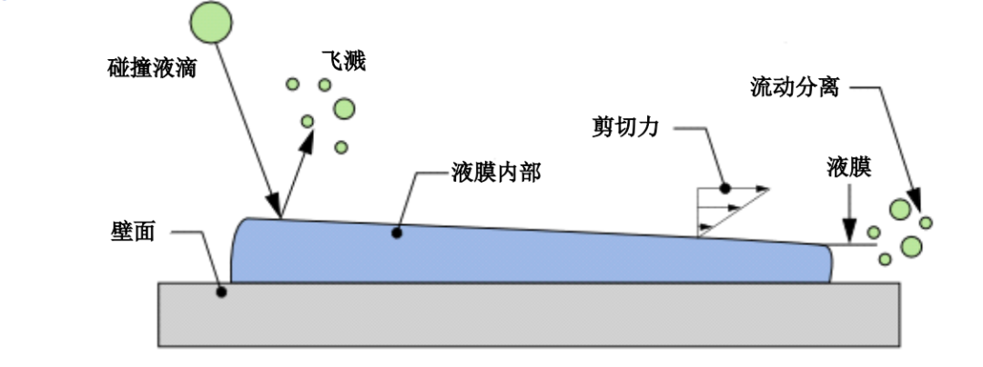 ④ 飞溅:其中有一部分液滴融入薄膜当中,剩下的部分以小液滴的形式离开壁面。