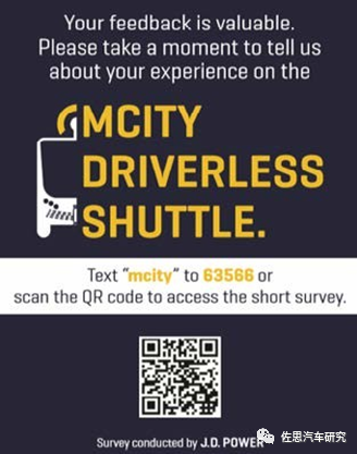 J.D.Power 和 Mcity 进行了简短的在线调查,并欢迎乘坐无人驾驶班车,看到无人驾驶班车,或与无人驾驶班车互动的任何人提供反馈。行人,其他车辆驾驶员,骑自行车的人等被归类为“非驾驶员”。可通过电子邮件,QR 码或短信文本参与该调查。