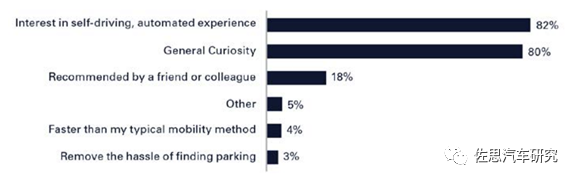 大部分受访者(86%)坐过一次无人驾驶班车,无人驾驶班车代替了大部分的步行出行(47%),大部分是在下午乘车(63%)。对自动驾驶汽车的兴趣和好奇心仍然是乘车人的主要驱动因素。