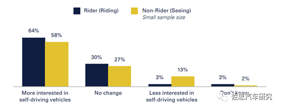 乘坐者和未乘坐者对无人驾驶班车的体验,积极影响了他们对个人拥有无人驾驶车辆的思考,由于乘坐无人驾驶班车或看到它正在运行,使人们对该技术产生了更多的兴趣。