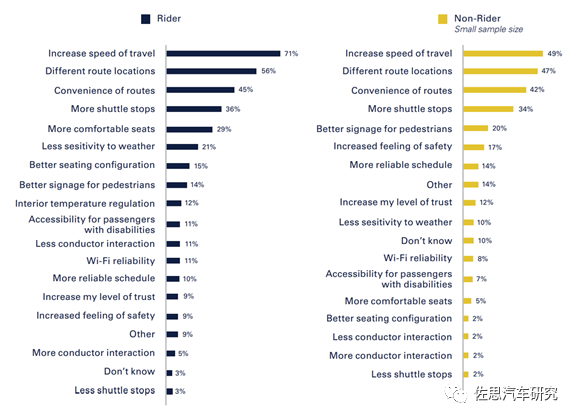 未乘坐者不乘坐无人驾驶班车的另一个原因是,其他交通方式速度更快。无人驾驶班车的速度限制为 12 英里 / 小时,平均约为 10 英里 / 小时。缓慢的速度使乘坐者感到舒适,因为风险较低,但它却破坏了无人驾驶班车成为日常出行的可行解决方案。对于乘坐者和未乘坐者而言,提高行驶速度是最高评价的解决方案,其次是改善路线,便利性和站点数量。