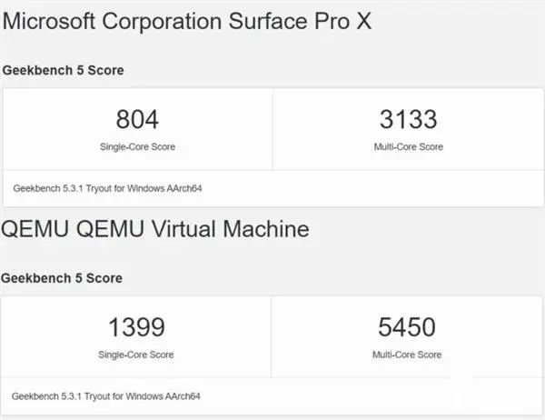 另外,据外媒报道,GeekBench 5 最新的基准测试数据显示,使用 QEMU 虚拟机运行 ARM 版 Win10 的 M1 版 MacBook,无论是单核还是多核表现,都要比 Surface Pro X 好。其中 M1 版 MacBook 的多核成绩相较于微软自家的笔记本电脑要高出 2000 分。