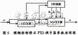 模糊PID控制器的原理是把输入PID调节器的偏差e和偏差变化率ec同时输入到模糊控制器中。图中的F控制器实际上是由三个分模糊控制器组成的,分别对三个参数进行调节,然后分别经过模糊化、近似推理和清晰化后,把得出的修正量分别输入PID调节器中,对三个系数进行实时在线修正,从而使被控对象具有良好的动态和静态性能。