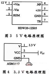 整个系统包含3.3 V,5 V,12 V,24 V四个电压环境。其中,3.3 V给单片机系统供电,5 V给旋转编码器供电,12 V直接由交直流变压器引出给驱动电路供电,24 V直接由交直流变压器引出给电机供电。5 V由12 V通过HDW20-12S05电源模块得到,如图3所示。3.3 V由5 V通过AMS1117芯片得到,电路如图4所示。